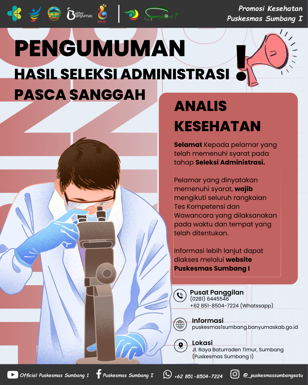 Hasil Seleksi Administrasi Pengadaan Pegawai Non Aparatur Sipil Negara (ASN) pada Badan Layanan Umum Daerah (BLUD) Unit Pelaksana Teknis (UPT) Dinas Kesehatan Kabupaten Banyumas - Puskesmas Sumbang I, tahun 2025